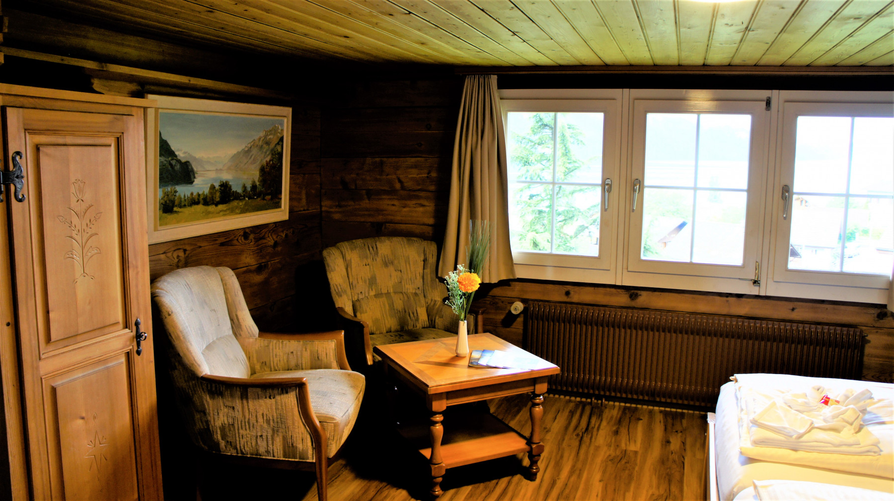 Unser Zimmer Nr.4 befindet sich im 1. Stock und verfügt über ein Doppelbett mit zwei einzelnen Matratzen, einen Doppelschrank, eine Sitzecke mit zwei Sesseln und ein eigenes Waschbecken. Sie haben Sicht auf den Brienzersee.