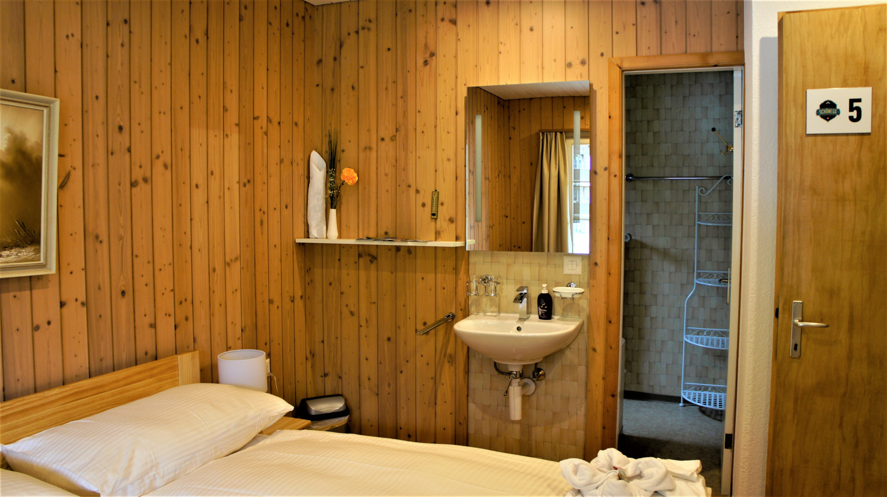 Unser Zimmer Nr.5 befindet sich im 1. Stock und verfügt über ein Doppelbett mit zwei einzelnen Matratzen, einen Schrank und ein eigenes Badezimmer mit WC und Dusche. Sie haben Sicht auf die Berge.