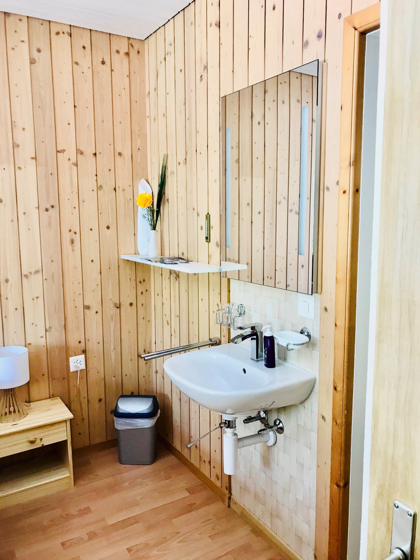 Unser Einzelzimmer befindet sich im 2. Stock und verfügt über ein Einzelbett, zwei Schränke, eine Kommode und ein eigenes Waschbecken. Sie haben Sicht auf die Bergseite.