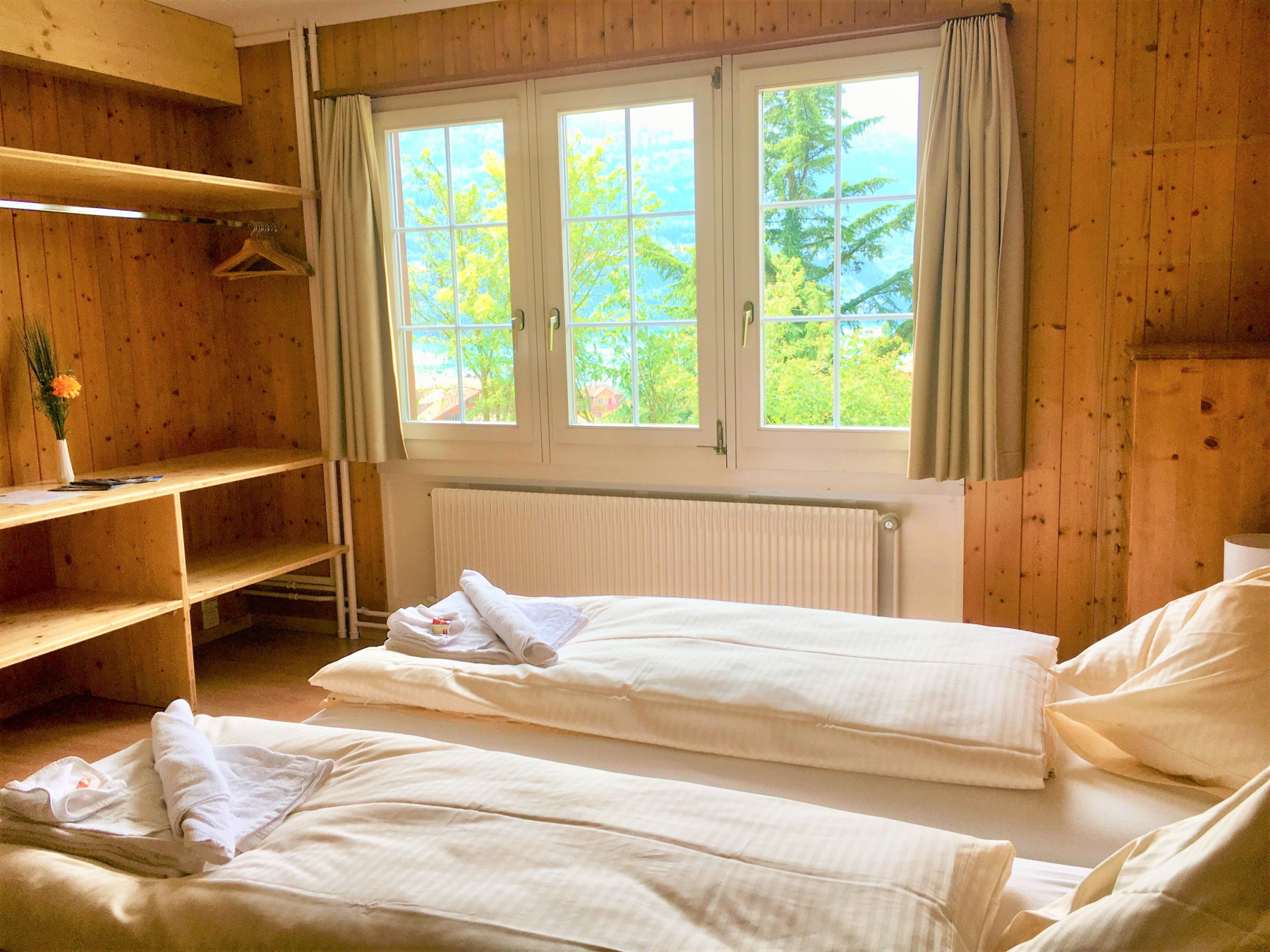 Unser Zimmer Nr.3 befindet sich im 1. Stock und verfügt über ein Doppelbett mit zwei einzelnen Matratzen, zwei Schränke und ein eigenes Waschbecken. Sie haben Sicht auf den Brienzersee.